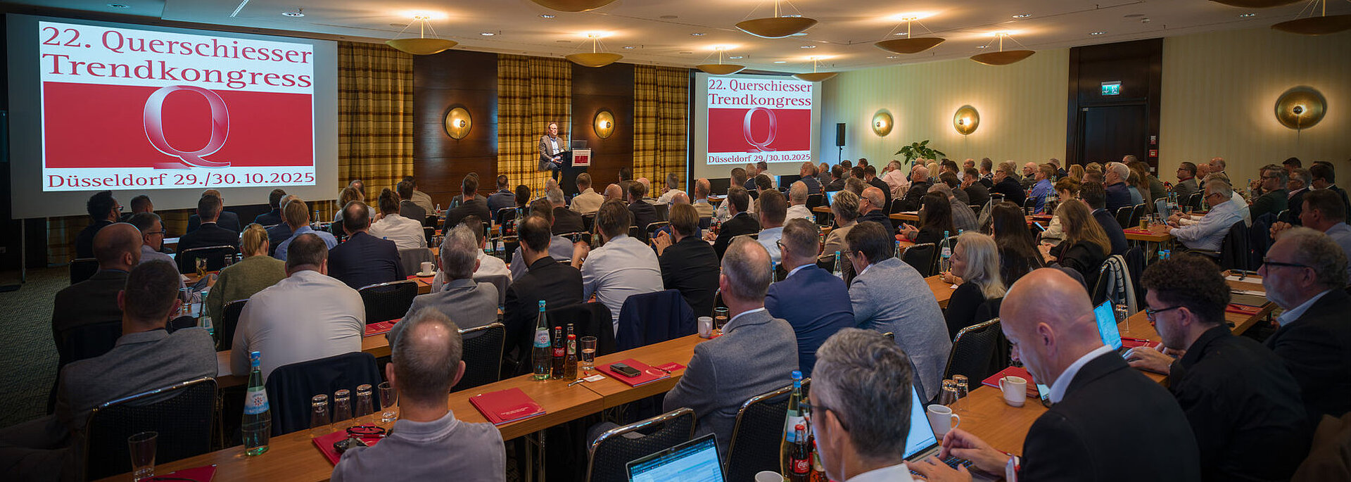 Seit dem ersten Querschiesser-Trendkongress begleiten wir die Veranstaltung – von der Einladungsmechanik bis zur Organisation vor Ort. Für den 22. Querschiesser-Trendkongress in Düsseldorf konnten wir das Vorjahresniveau trotz massiver Sparmaßnahmen in der Branche halten. Für 2026 erwarten wir erneut eine wachsende Anmeldezahl.